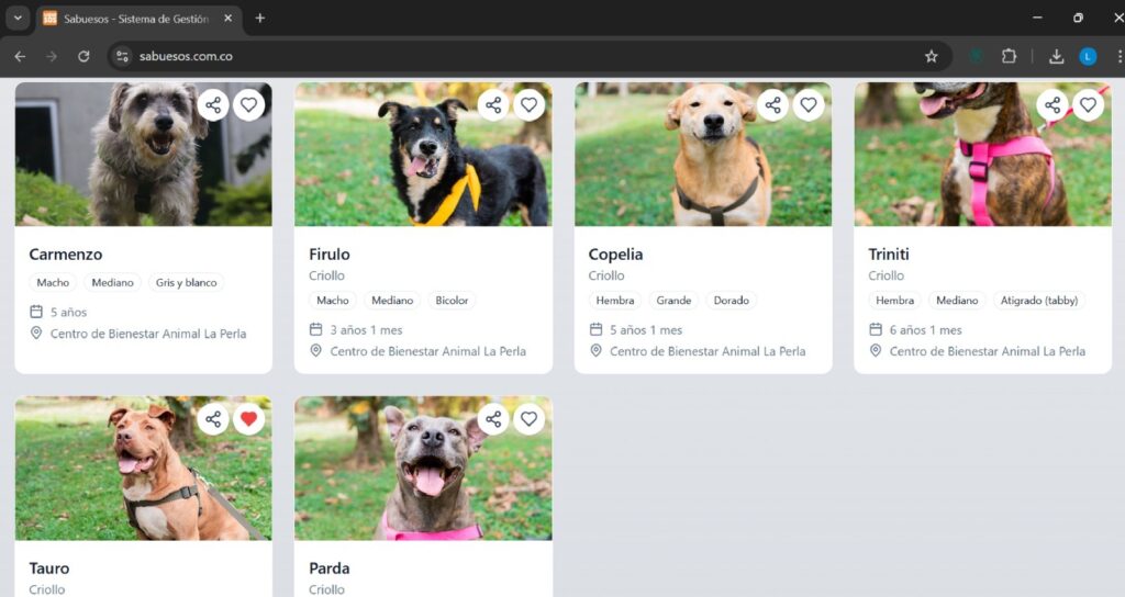 La plataforma www.sabuesos.com.co ofrece filtros por especie, tamaño, edad y sexo, además de fotografías y descripciones de cada animal. Una vez el ciudadano selecciona la opción “Me interesa adoptar”, el sistema envía la solicitud al equipo de adopciones, que evalúa el caso y acompaña cada etapa del proceso.